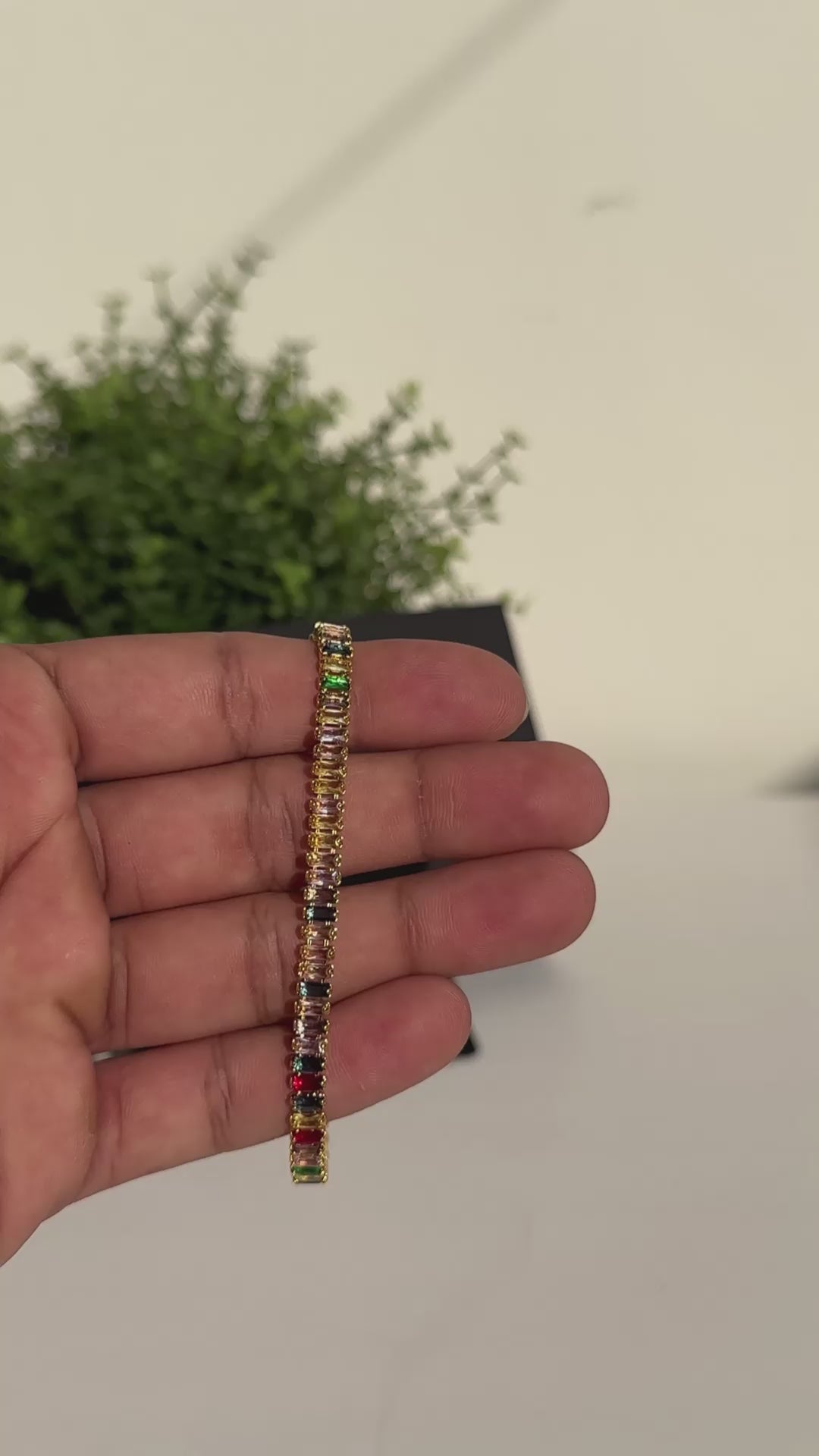 A vibrant take on a classic silhouette, the Spectrum Baguette Tennis Bracelet features a stunning array of multicolour baguette-cut stones set in a warm gold-tone finish. Designed to catch the light from every angle, it adds a bold yet refined touch to any look. Perfect worn solo or stacked for a statement style.